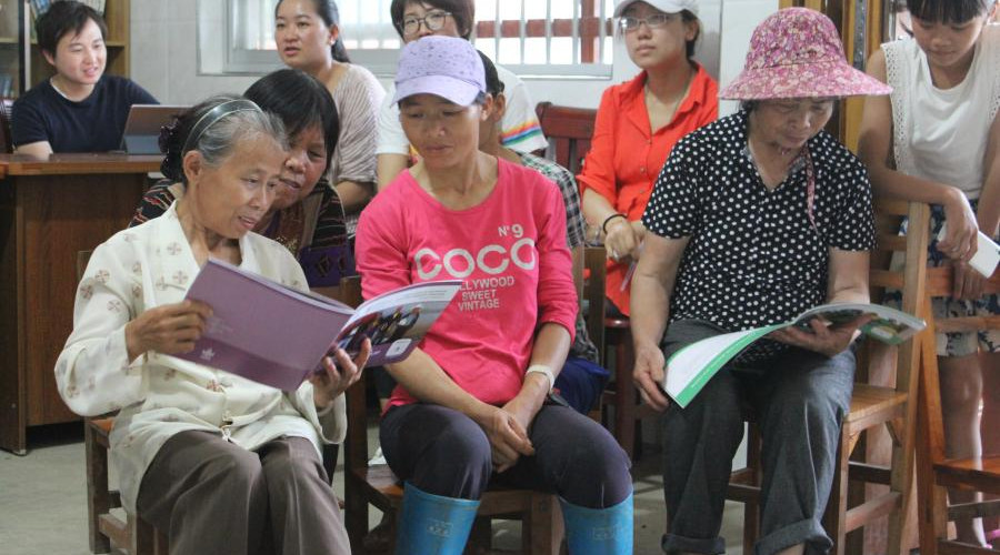 Bringing seed to the community seed bank, Guangxi (L). Farmers read Community Seedbank handbooks (R).Credit: Alliance of Bioversity and CIAT/R.Vernooy